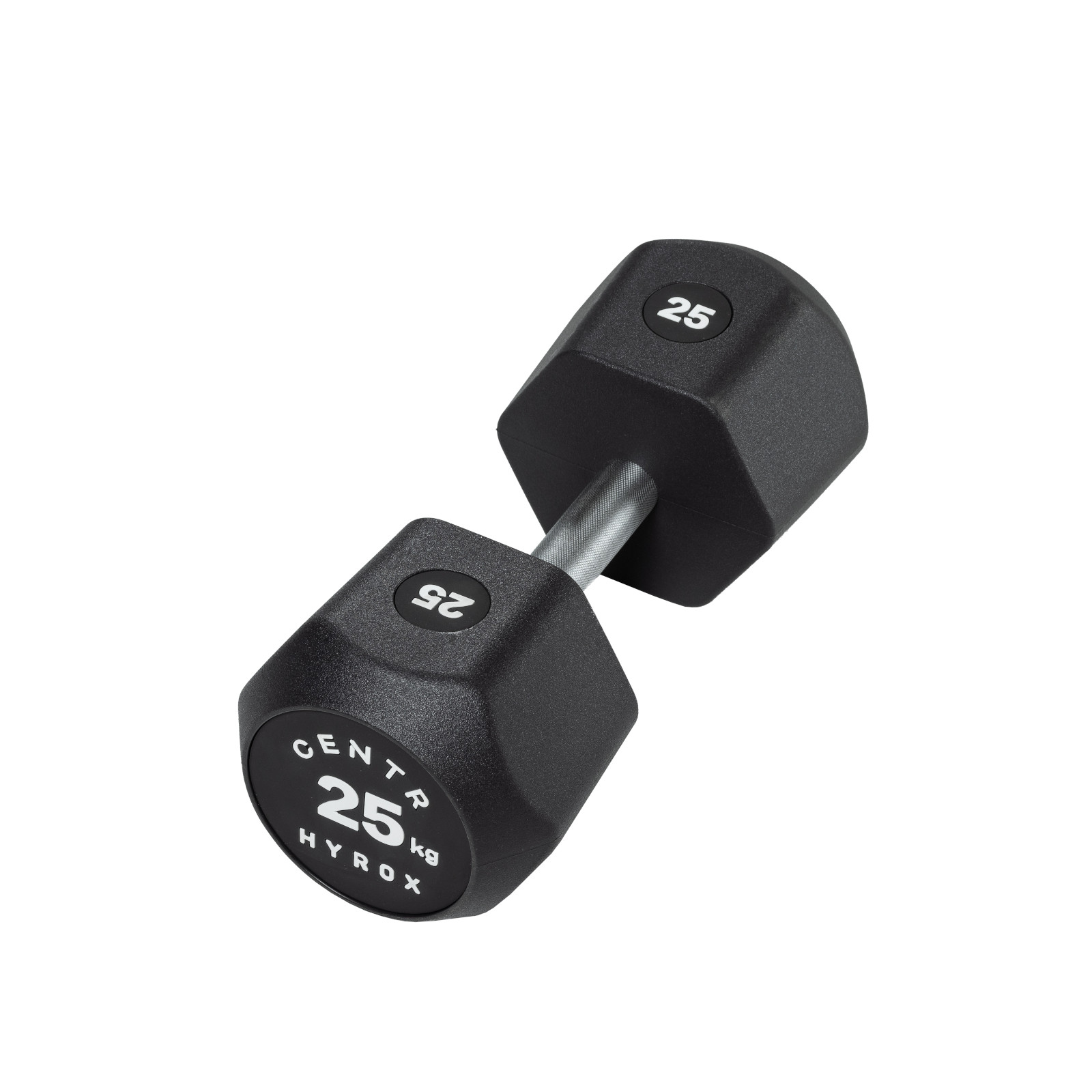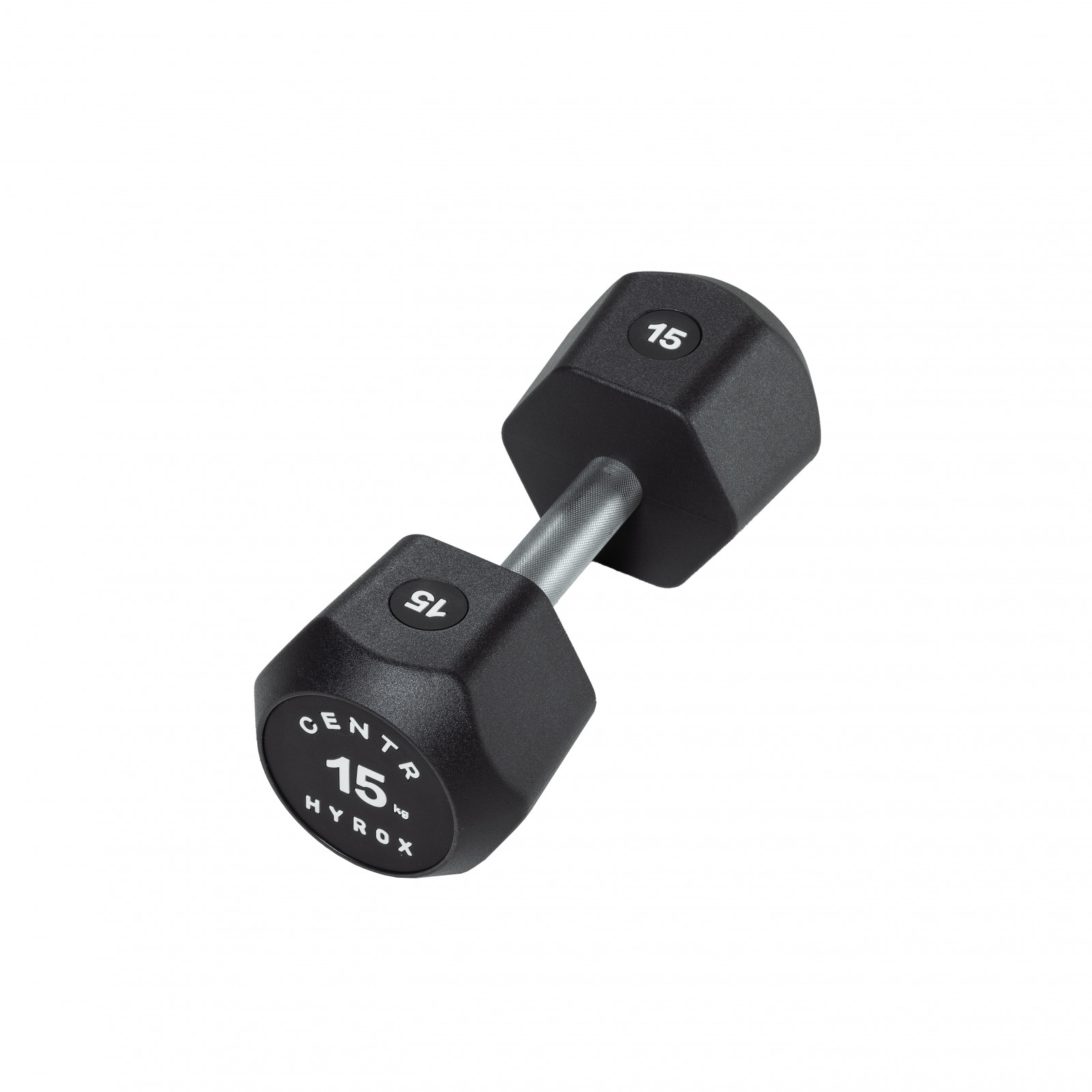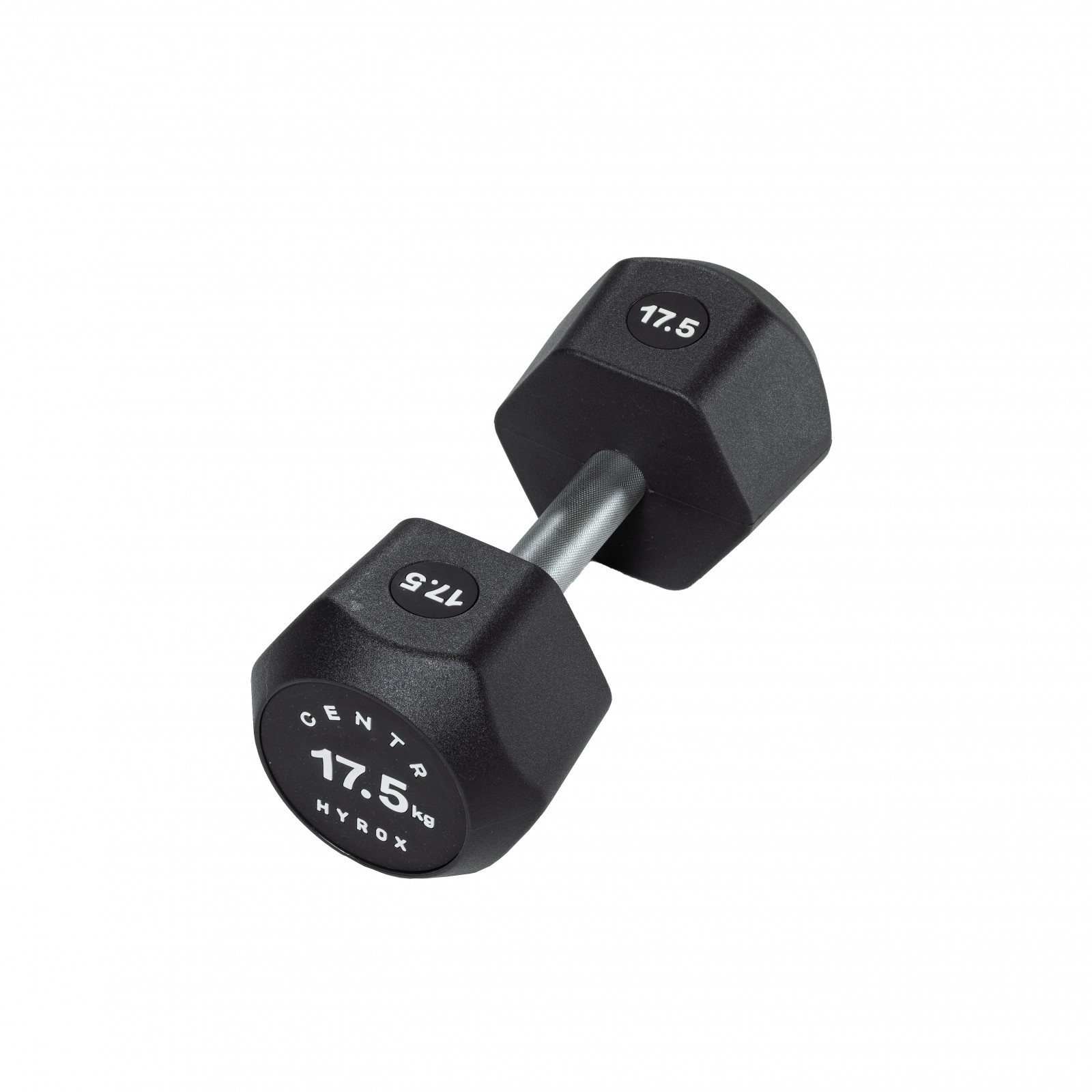 Het CENTR x HYROX Urethane Dumbbell ontwikkeld voor functionele trainingen en HYROX-workouts waarbij duurzaamheid centraal staat. De dumbbell heeft een stalen kern met dubbel gelaste koppen voor structurele stabiliteit tijdens intensief gebruik. De buitenlaag bestaat uit een UV-bestendige en slijtvaste urethaancoating die zowel het materiaal als de vloer beschermt. Dankzij de zeshoekige anti-rolvorm blijft de dumbbell stabiel op vlakke ondergronden, terwijl de rechte, geribbelde stalen greep zorgt voor consistente handplaatsing en optimale controle bij lichtere gewichten. De duidelijke gewichtsaanduiding op zowel het platte ronde vlak als de zijkanten verbetert de leesbaarheid vanuit meerdere hoeken.Deze dumbbell is ideaal voor krachttrainingenn, conditioneringsintervallen en warming-up- of bewegingen zoals lunges, presses, rows en carries. De rechte greep bevordert een consistente houding bij verschillende bewegingen, en de ribbel geeft grip zonder te oncomfortabel aan te voelen, zelfs bij zweterige handen. Voor langdurig gebruik wordt aanbevolen de dumbbell neer te zetten in plaats van te laten vallen, de greep schoon te maken na gebruik en het materiaal binnenshuis op te bergen, uit direct zonlicht, om de urethaanafwerking te behouden.