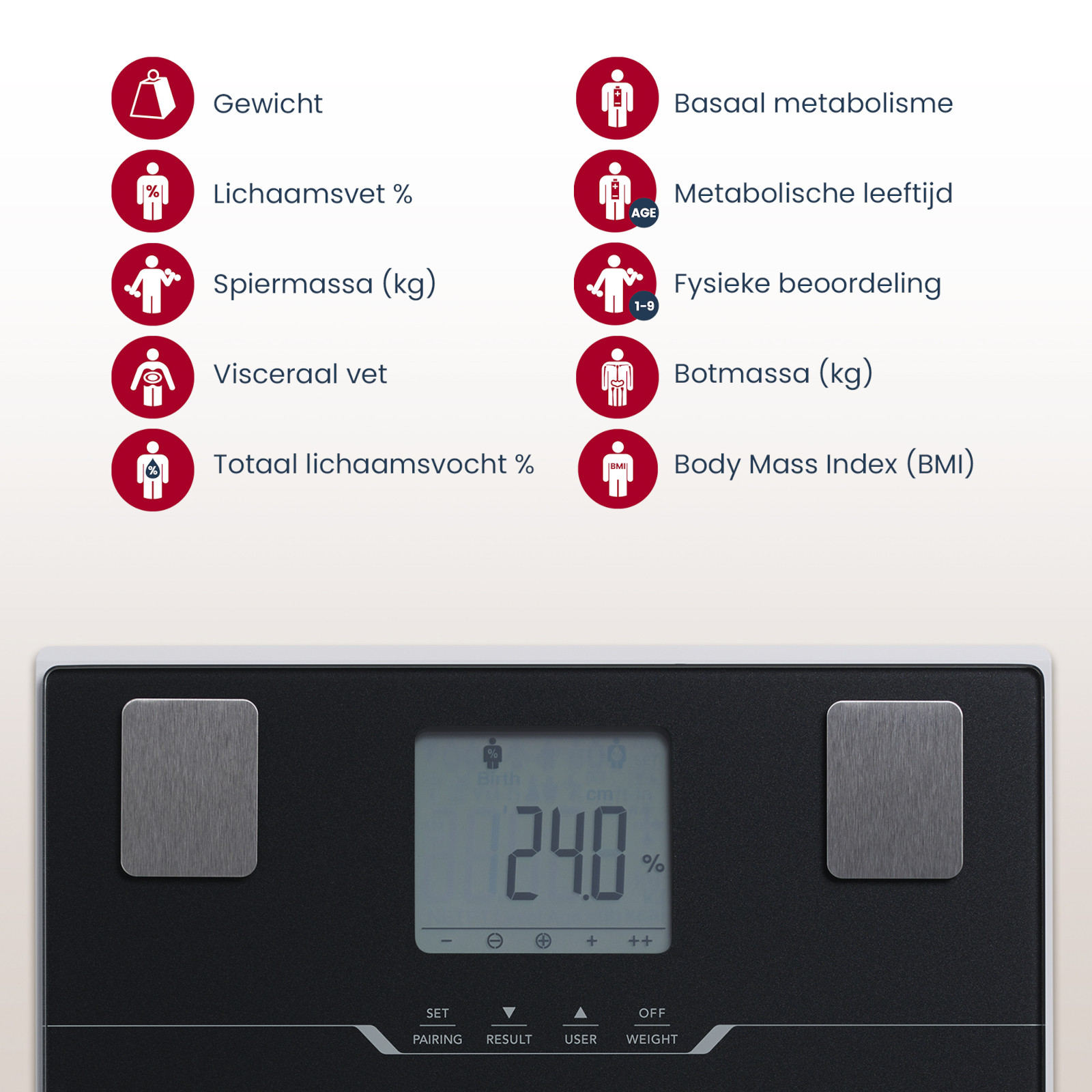 - De elektroden zijn zo geplaatst dat je zelfs metingen kunt doen als je voeten groter zijn dan de weegschaal